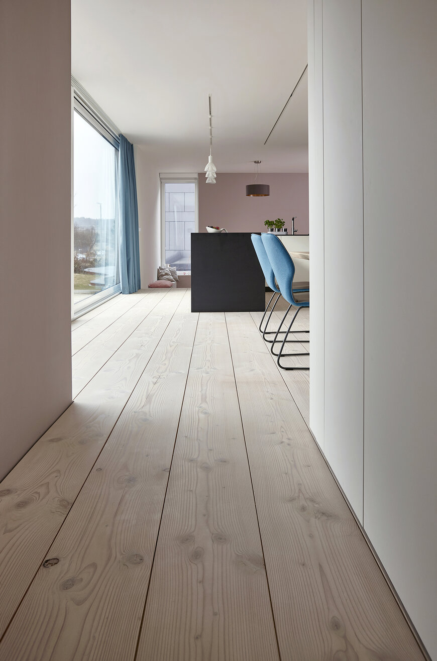 … plus on va se diriger vers des lames étroites (< 60 mm) ou de largeur classique (60 à 120 mm). Ces dernières vont apporter de la perspective et de la précision, ainsi qu’une illusion de grandeur. A contrario, si l’on choisit des lames plus larges, la pièce va paraître exiguë car il y aura très peu de rangées.