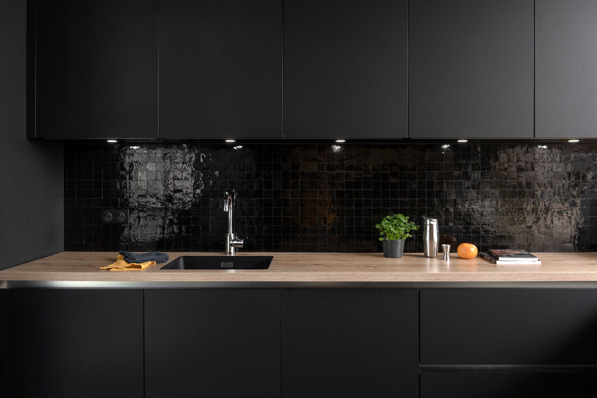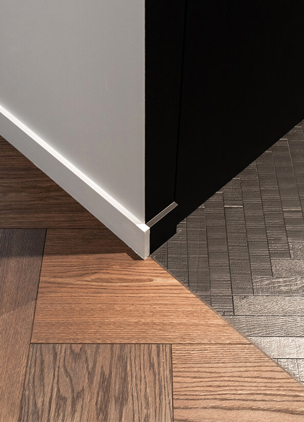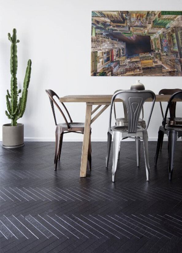 Dans cet appartement en rez-de-jardin, le parquet noir s'est naturellement imposé pour sa propriétaire, inconditionnelle de cette couleur. Elle a opté pour un bâton rompu très moderne, aux lames XXS, qui donne beaucoup de caractère à l'appartement, du salon à la cuisine jusque dans la salle de bain