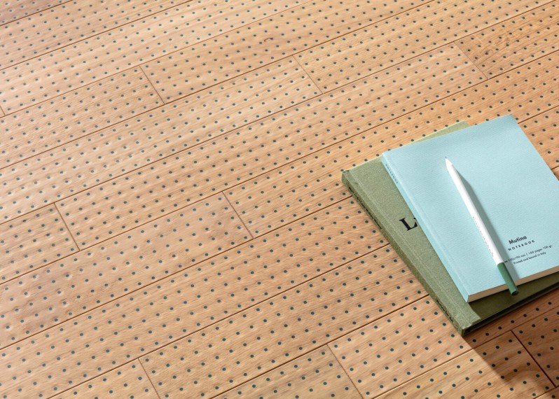 Ce parquet reprend le motif graphique de Pico - la première collection réalisée par les designers- composé de points rouges et bleus et l'intègre parfaitement à la texture naturelle du bois. Chaque lame de la collection raconte une histoire de tradition et d'innovation, fusionnant l'essence chaleureuse du bois avec des éléments graphiques modernes, un hommage à la fois au passé des deux designers et à leur vision artistique.