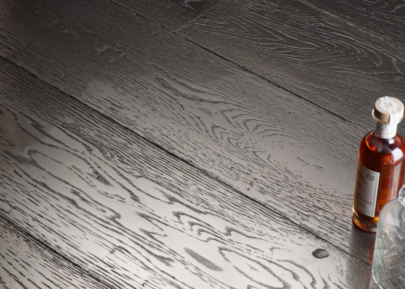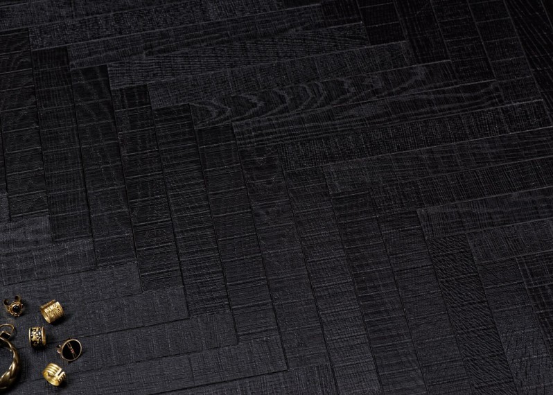 Un gris anthracite avec une légère nuance brune, dense et chaleureux, comme imprégné dans le bois. En version XXS (42mm), ce parquet peut être posé en bâton rompu, à l'échelle ou en coupe de pierre. Et en salle de bain.