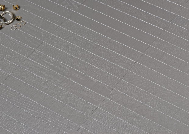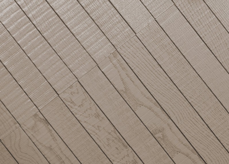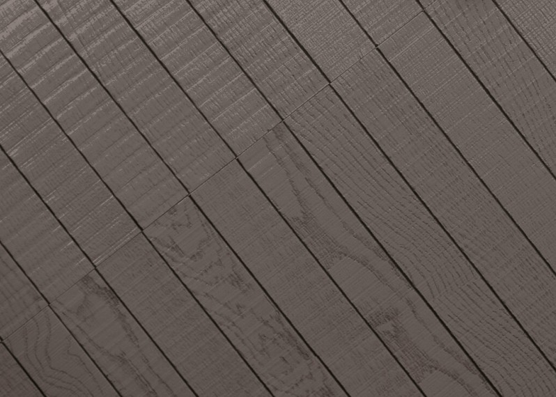 La surface des lames est brute et texturée (brut de sciage ou brossée). Après la pose, on les recouvre d'une micro-résine protectrice, teintée et opaque, qui imprègne parfaitement la matière. Très couvrante, elle dissimule le veinage du bois tout en laissant sa texture apparente. La surface est ensuite protégée par un vernis semi-mat qui donne au parquet un éclat satiné et un toucher soyeux. Ce cycle de finition, réalisé par un professionnel, est éco-compatible et garantit des niveaux élevés de protection contre l’usure et l’abrasion du bois. Y compris l'humidité. Ce qui rend ce sol idéal en salle de bain.