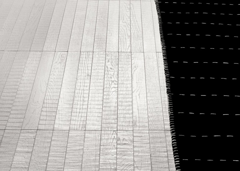 La surface des lames est brute et texturée (brut de sciage ou brossée). Après la pose, on les recouvre d'une micro-résine protectrice, teintée et opaque, qui imprègne parfaitement la matière. Très couvrante, elle dissimule le veinage du bois tout en laissant sa texture apparente. La surface est ensuite protégée par un vernis semi-mat qui donne au parquet un éclat satiné et un toucher soyeux. Ce cycle de finition, réalisé par un professionnel, est éco-compatible et garantit des niveaux élevés de protection contre l’usure et l’abrasion du bois. Y compris l'humidité. Ce qui rend ce sol idéal en salle de bain.