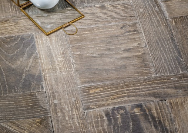 Façonné en atelier, ce gris délavé et structuré a tous les ingrédients d'un vieux plancher. Patine à l'ancienne, pièces métalliques, gerces, fentes en bout, tâches naturelles, traces de sciage... autant de "défauts" qui font tout son charme.