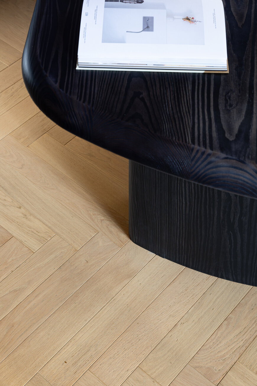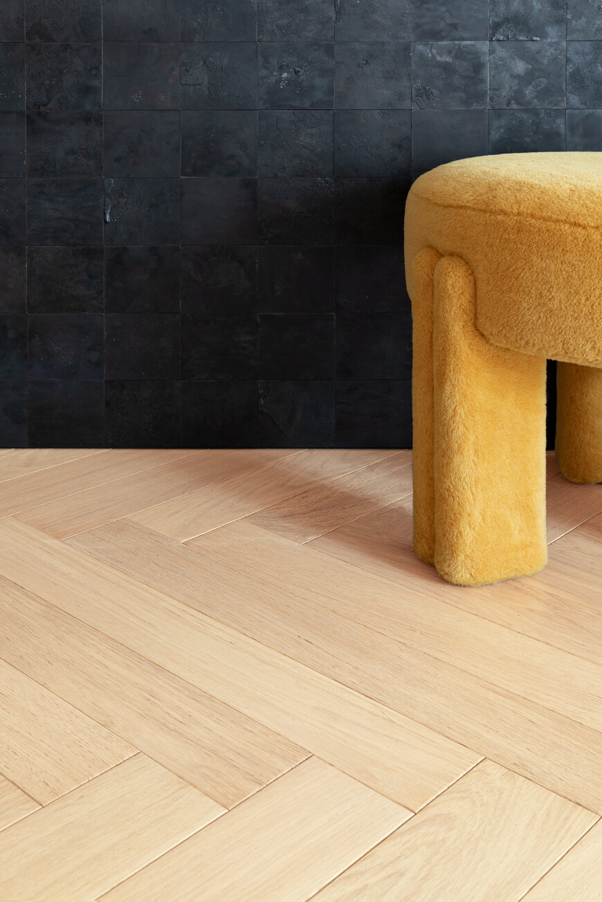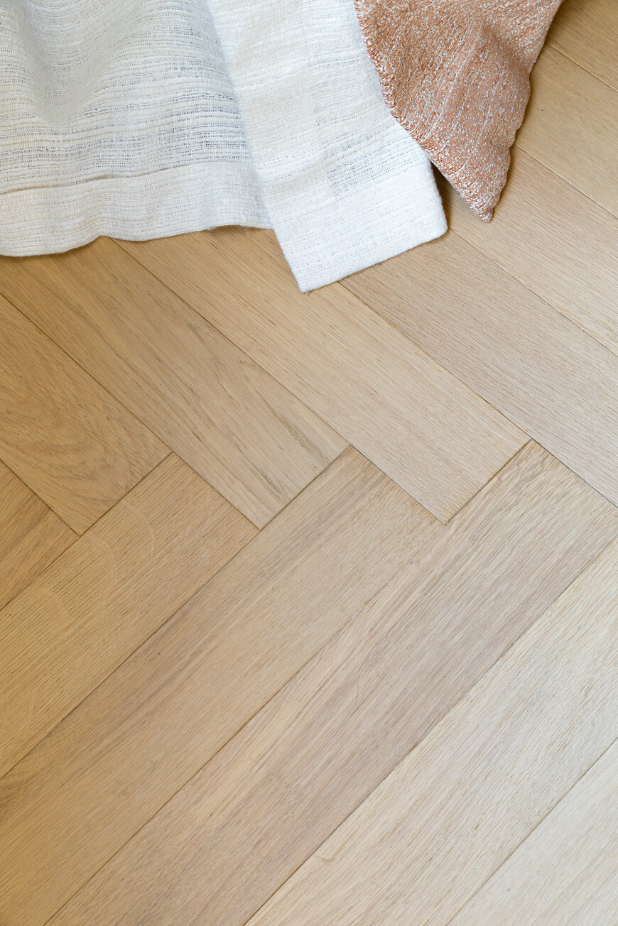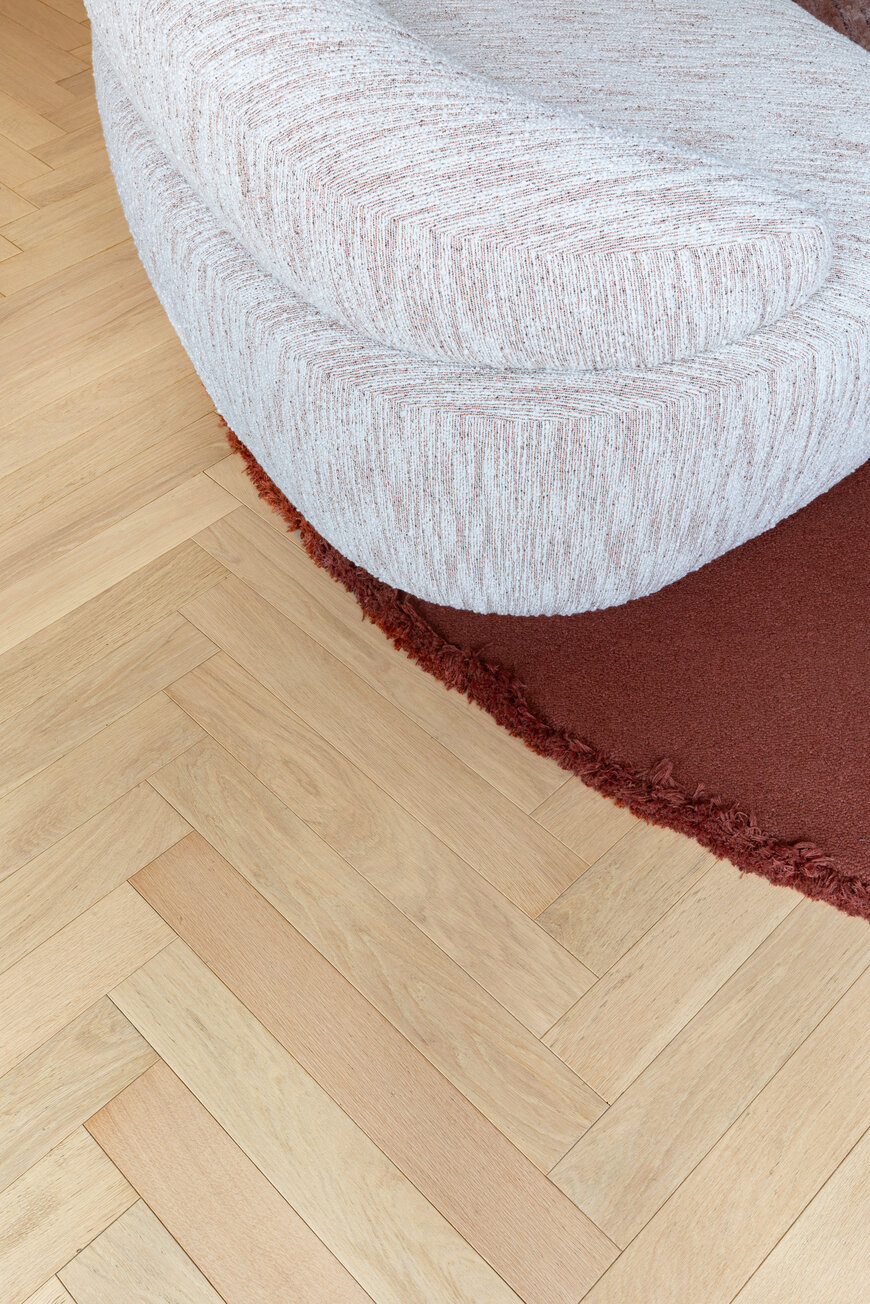 L'atelier a choisi un parquet en bâton rompu, choix premier (pas de nœuds), dans la simple et élégante teinte Palais Royal. Il nous vient de Bourgogne et est 100% PEFC.