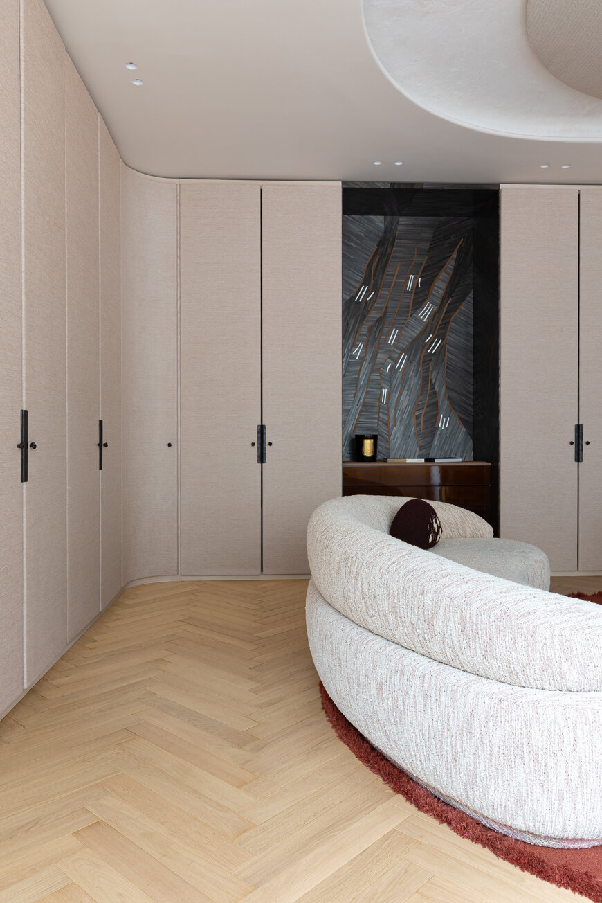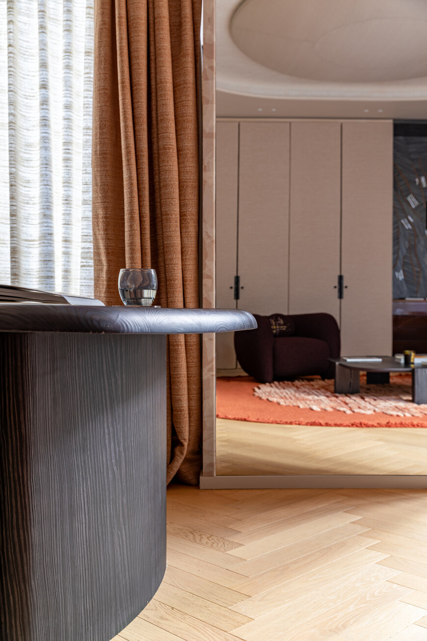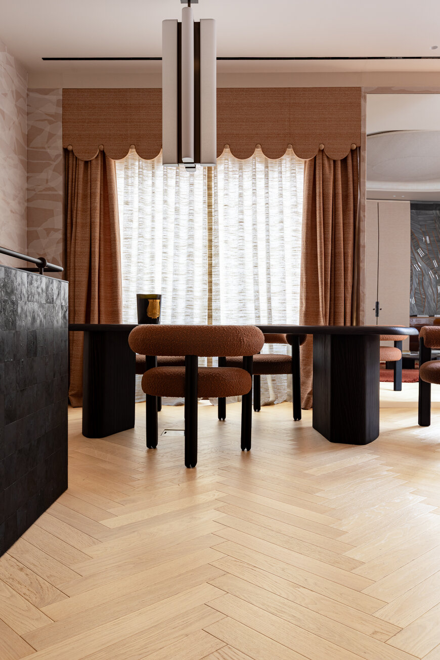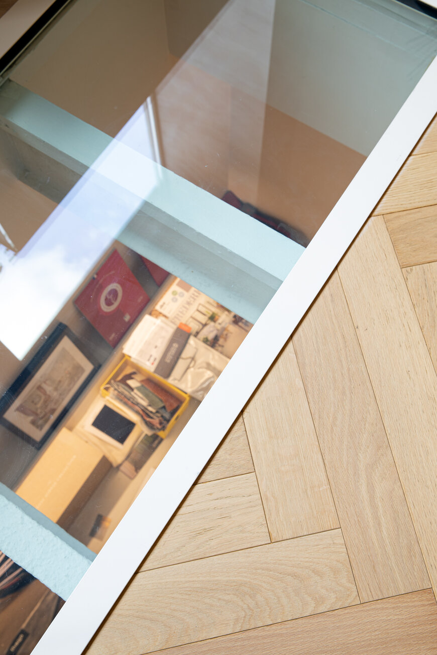 L'atelier a choisi un parquet en bâton rompu, choix premier (pas de nœuds), dans la simple et élégante teinte Palais Royal. Il nous vient de Bourgogne et est 100% PEFC.