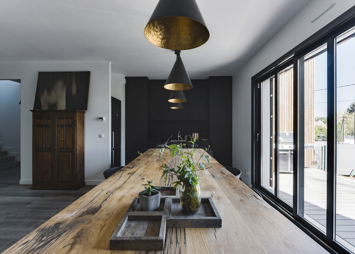 Plateau en vieux bois et cuisine graphique noir mat, un combo gagnant.