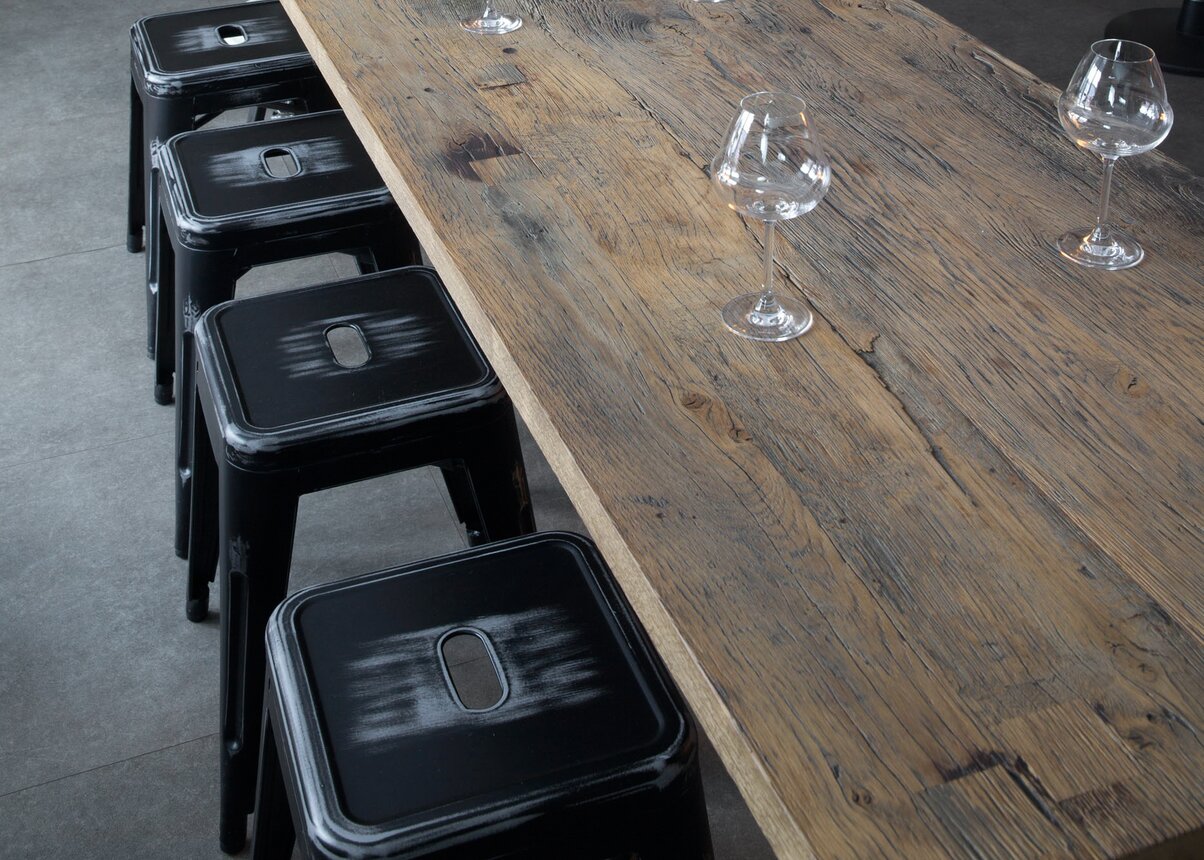 Plateaux en vieux bois et pieds en acier deviennent tables bistrot et grandes tablées.