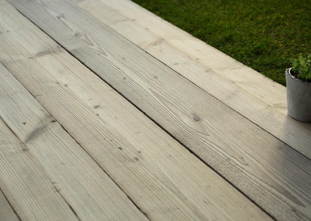 Si vous êtes ici c'est que vous aimez le bois sincèrement et avec ses particularités. Regardez cette terrasse de plus près, elle a les nuances grises du bois qui a pris le soleil pendant de longues années. Cette teinte est totalement naturelle puisque ces lames de bois massif en sapin ont toutes été récupérées sur d'anciens échafaudages.